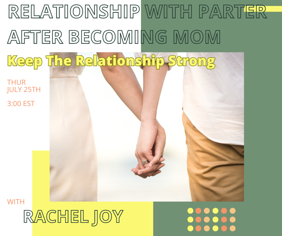 Back to All Events Relationship with Partner after Baby Thursday, July 25, 2024 3:00 PM 4:05 PM Google Calendar ICS Join us to talk about all things Relationship Change after we become moms! Learn Rachels 3 prong approach to helping keep the relationship strong in this crazy changing season of our life! Join us Here:https://us06web.zoom.us/j/82517223841?pwd=CqSnBFvGHdo0NRpFhayxLsrirnkY95.1The replay will be available in the Replay section.
